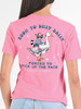 Fancy candy pink short sleeve shirt with the phrase 'Born to dilly dally, forced to pick up the pace' and a raccoon riding a goose. Simply Southern logo below and on left chest. 100% cotton. Unisex youth sizing.