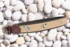 Leather belt ends with a solid brass buckle with cotton webbing around the waist