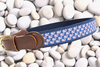 Leather belt ends with a solid brass buckle with cotton webbing around the waist.