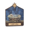 Wooden creche shaped wall hanging with decoupaged artwork. Has artwork of Baby Jesus in a manger with a golden star above him. Also above Baby...