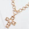 Add a touch of charm with the Clampett Cross Necklace in Gold. Featuring a worn gold finish, a toggle accent, and a cross pendant adorned with large pearls, this necklace brings playful elegance to any outfit. The back clasp and extender ensure you can wear it just the way you like, making it a versatile favorite for day or night.