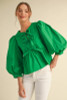 Cotton poplin peplum tie top features an open round neckline with tie closures and three quarter balloon sleeves, and ban…