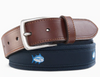 Add some color to your look with our 1 3/8 inch belt that features the Skipjack emblem printed on nylon ribbon. This belt is finished with silver hardware and leather-front belt holes and tabs.