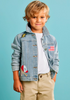 Denim jacket with Mud Pie shank buttons features five patches: lightning bolt, American flag, baseball gear, dinosaur and "DUDE" lettering.