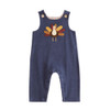 Appliqued cotton twill longall with coconut wood button shoulders. Inner leg snaps.