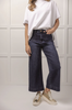 Stretch denim jeans feature wide leg, front patch pockets, back pockets and zipper-fly with tortoise button closure. Inseam measures approximately 26 3/4" on size small.