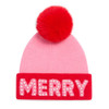 One Size, Made from acrylic, nylon, polyester, and faux pearls, Spread cheer from head to toe with the “Merry” Beanie with Pearls! This playful knit beanie features a bold red and pink color block design and is topped with a fluffy red pom for an extra pop of fun. The word “Merry” is spelled out across the front in soft chenille letters adorned with delicate pearl accents for a dash of glam. Cozy, cute, and full of festive flair, it’s the perfect cold-weather companion for all your holiday outings.
