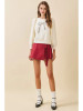 A cotton skort featuring a wrap-front design with braided trim along the waist and side. Detailed with a self…